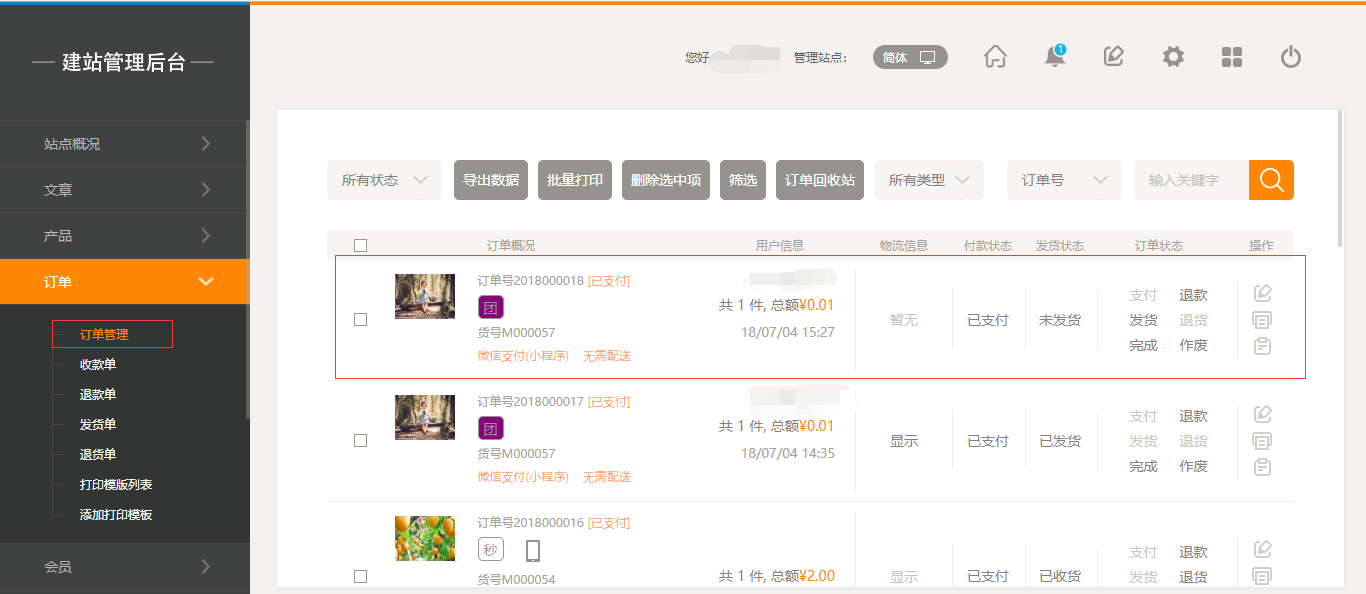 2.后台在“订单列表”中,可以看到有所有的订单详情,对订单进行操作;前端页面中,在会员中心的“我的订单”中可以看到相关订单,如图: